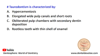 Taurodontism (Bull Teeth) is due to failure of hertwig's sheath to invaginate at the proper horizontal level. Mostly molars are involved and the body of tooth is enlarged at expense of roots resulting in rectangular teeth. The roots are short and the pulp chambers are extremely large lacking the usual constriction at cervix of tooth. It has been reported that many patients with Klinefelter syndrome exhibit taurodontism but is not constant feauture of this syndrome.